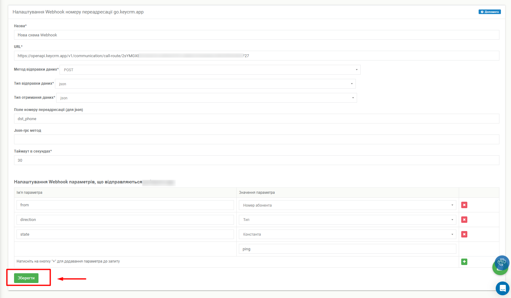 - URL - посилання на вебхук з налаштувань підключення в «Крок 2»;
