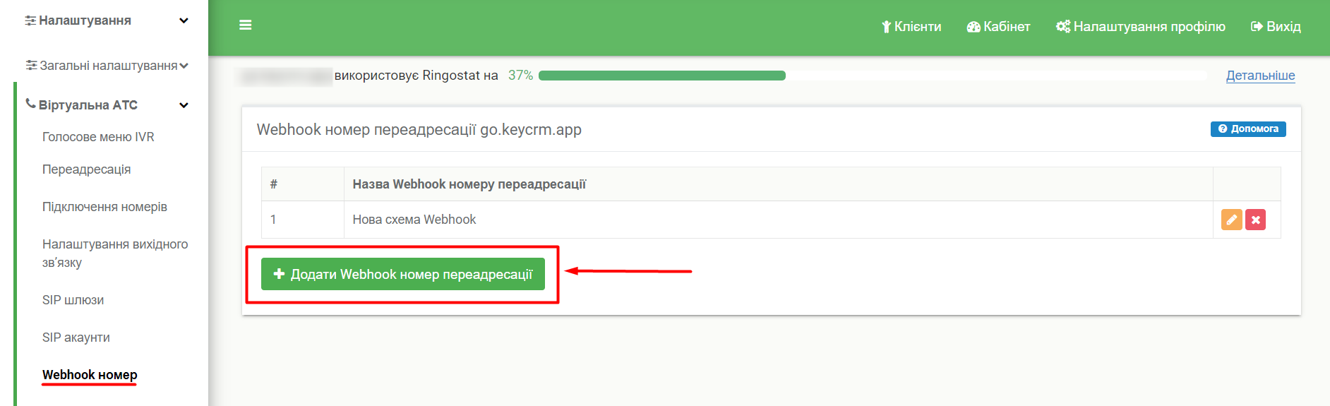 Перейдіть у «Налаштування» → «Віртуальна АТС» → «Webhook номер» та натисніть на кнопку «Додати Webhook номер переадресації»: