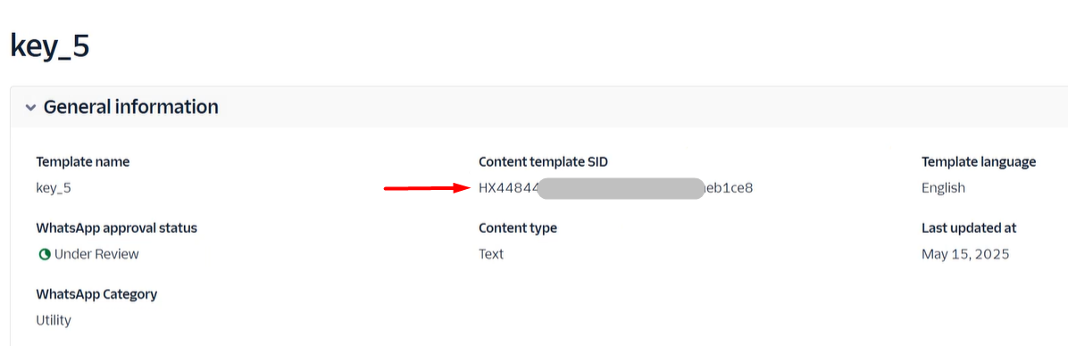 To copy a template's SID from Twilio, open the «Messaging → Content Template Builder» section and click on the desired template. In the window, you will see the SID for that template: