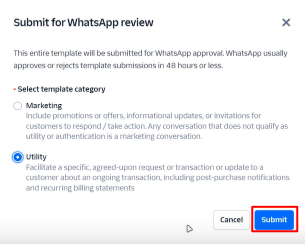 The template will be submitted to WhatsApp for review, which may take up to 24 hours. Once it has been successfully approved, you will see two green checkmarks next to it in the template list.