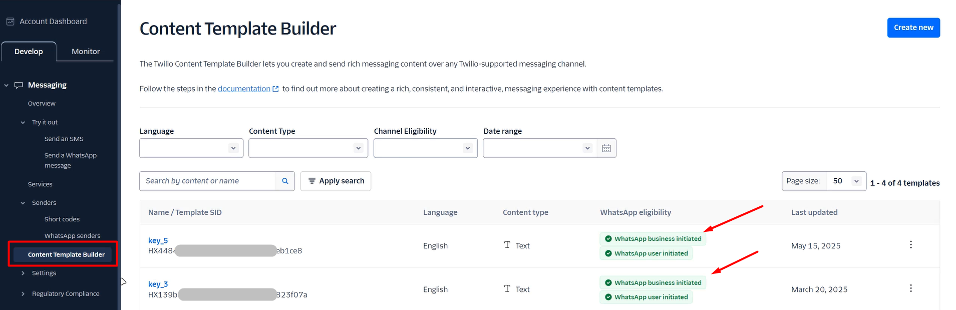 To add a new template in Twilio, open the «Messaging → Content Template Builder» section and click «Create new».