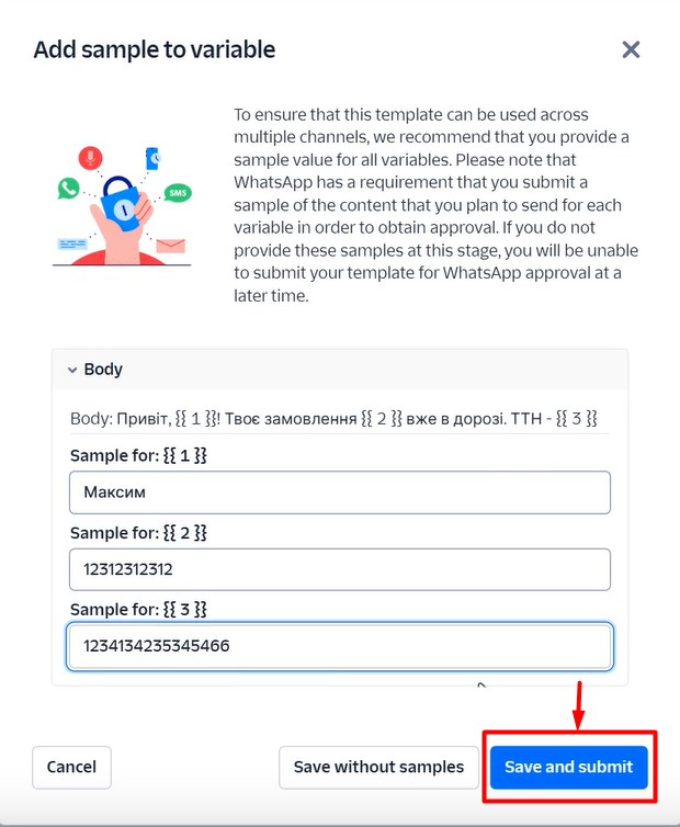 When you're ready, click «Save and submit for WhatsApp approval» at the bottom of the window. A window will open where you need to click on the body; a field will then appear for each variable in the template. In these fields, you need to enter sample data that will be substituted for these variables: