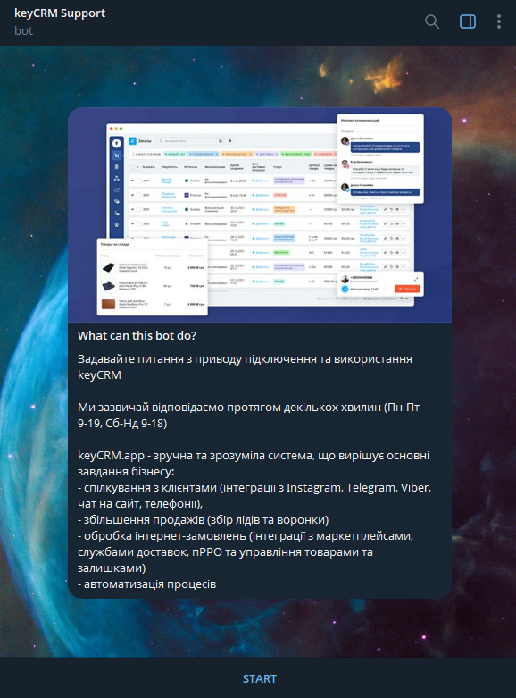 Functionality: Performs programmed tasks, responds to user requests, and can operate 24/7. Interacts with users via text or voice interfaces and can initiate actions based on specific triggers. To respond to a client via a Telegram or Viber bot, you must use specialized services such as KeyCRM :)