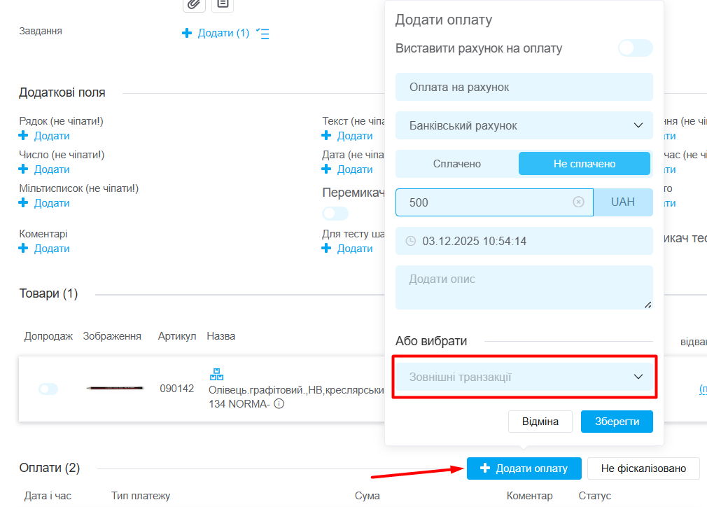 Відкрийте замовлення і в блоці «Оплати» натисніть кнопку «Додати оплату», після підключення платіжних сервісів, у цьому вікні у вас з'явиться поле «Зовнішні транзакції». Натисніть на нього та оберіть потрібний платіж зі списку: