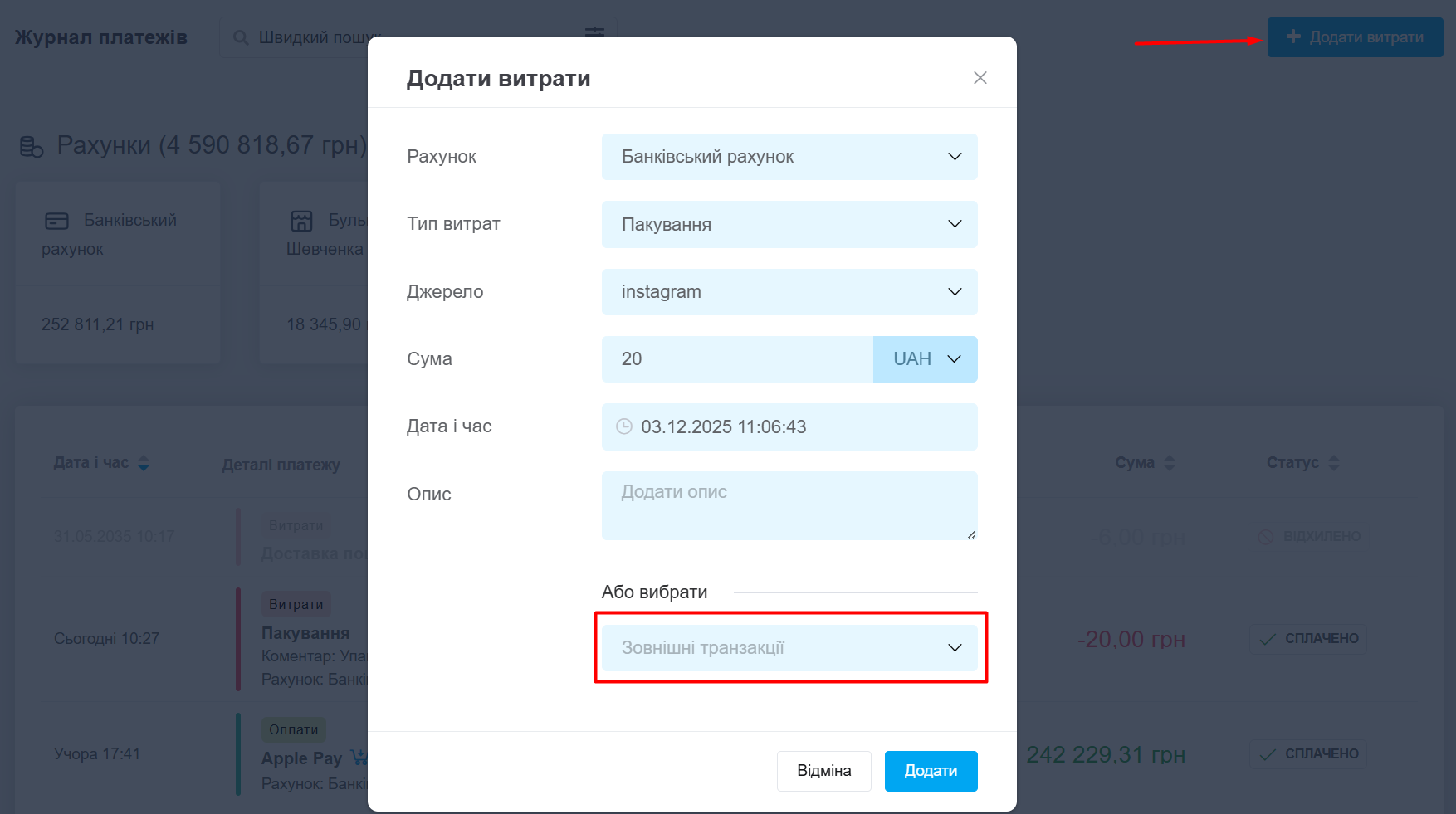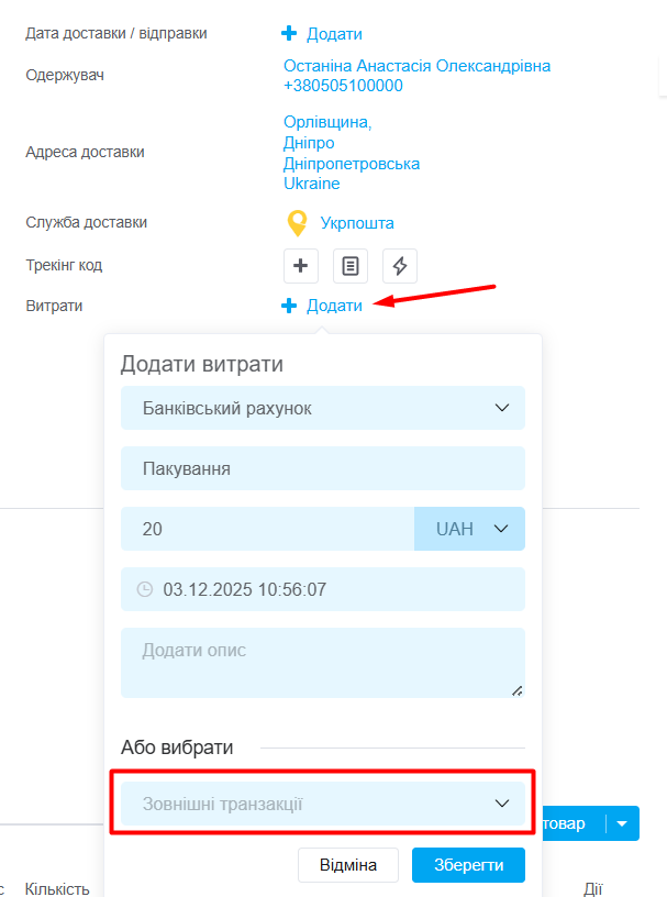 Відкрийте замовлення та у блоці праворуч натисніть на «Додати» навпроти рядка «Витрати». У відкритому вікні відобразиться поле «Зовнішні транзакції». Натисніть на нього та оберіть потрібний платіж зі списку: