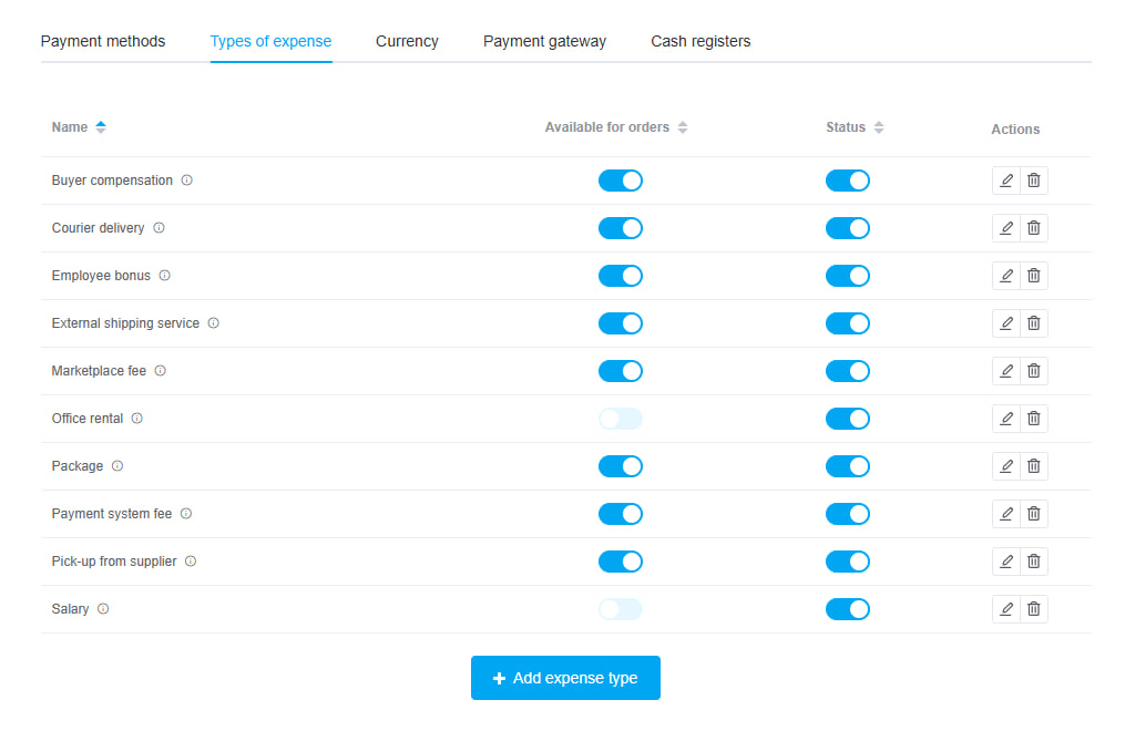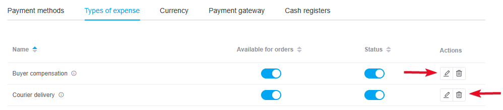 Delete — clicking on the trash can icon will remove the expense from the list, and it will no longer be available for selection in orders and for general expenses.