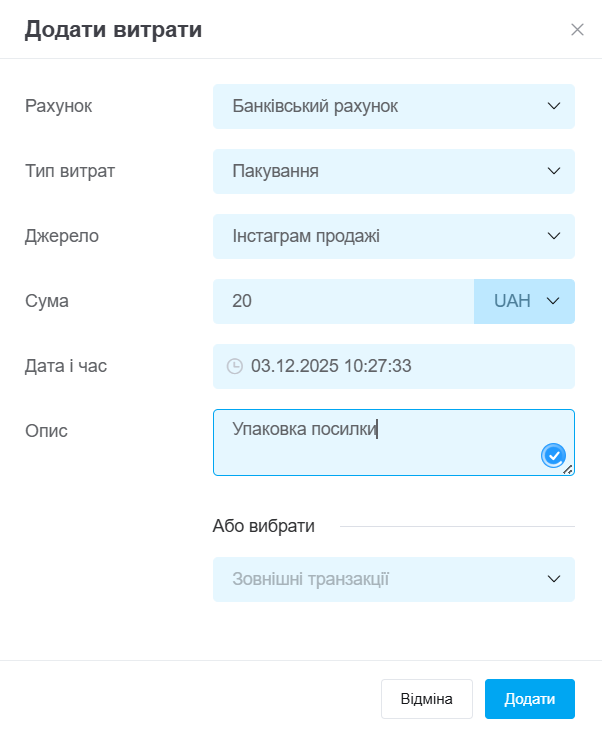 Джерело — якщо ці витрати належать до конкретного джерела (наприклад, витрати на рекламу), виберіть його;