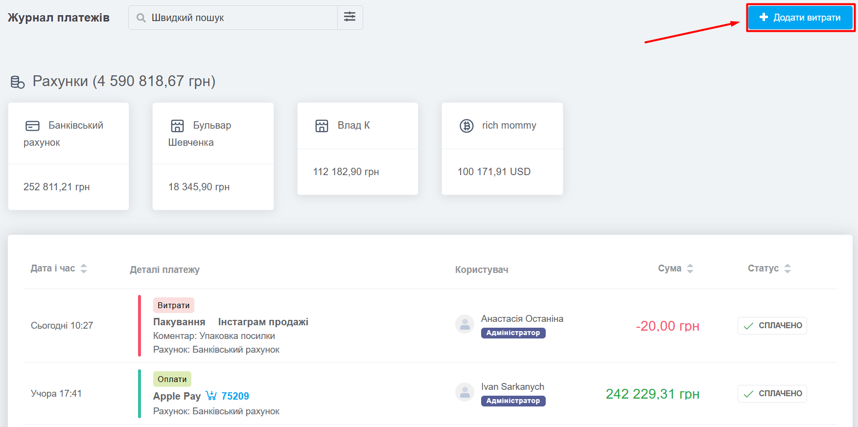 Після цього натисніть «Додати», витрата відразу створиться і відобразиться у списку в журналі платежів.