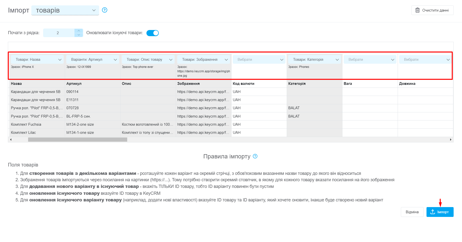 Рекомендуємо ознайомитись з прикладом таблиці для імпорту товарів.