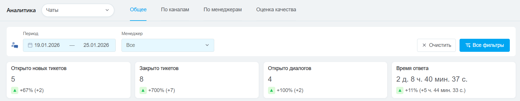 В разделе «Аналитика» → «Чаты» во вкладке «Общее» можно увидеть базовый отчет по тикетам и диалогам: