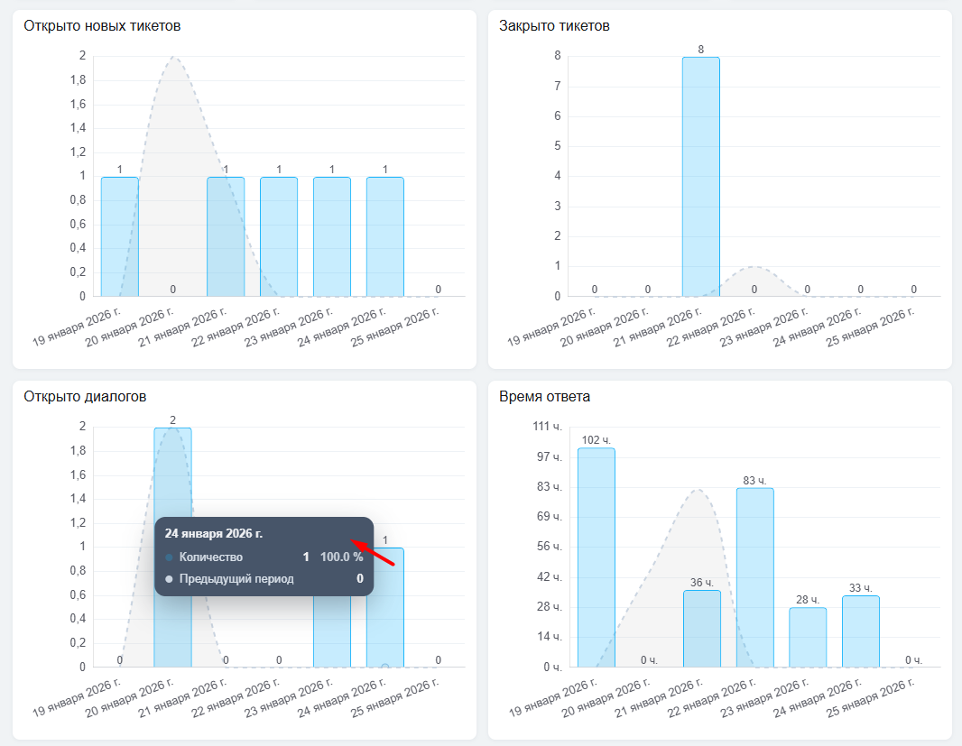 - Открыто новых тикетов — количество открытых тикетов в выбранном периоде;