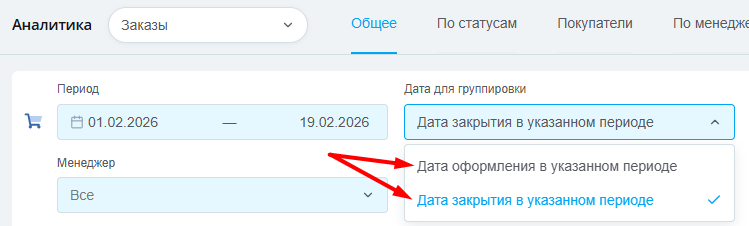 - «Дата закрытия в указанном периоде»: формирует отчеты по дате закрытия заказа (переход в статус группы «Выполнено») или карточки (переход в успешный статус) в течение выбранного периода, независимо от того, когда они были созданы.