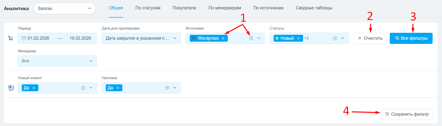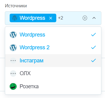 Предоставляет возможность просмотра отчетов по выбранному источнику в карточке или заказе. По умолчанию не выбраны и отчеты формируются по всем источникам.