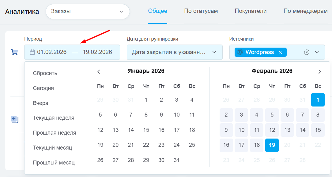 Можно выбрать любой период с самой старой даты создания заказа или карточки до сих пор. Выберите даты через календарь или введите вручную: