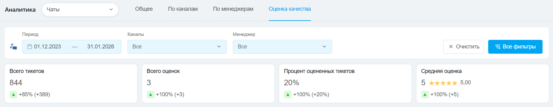 (всего тикетов / всего оценок) * 100; - Средняя оценка — среднее значение оценки чатов.