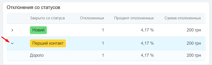 В таблице отображается перечень статусов, из которых отменялись карточки. Для каждого статуса доступна детализация — список причин (статусов отмены), в которые переходили каточки при отклонении.