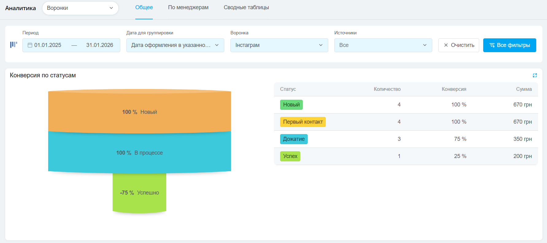 - Графическая воронка по группам статусов с процентом конверсии по отношению к первому статусу;