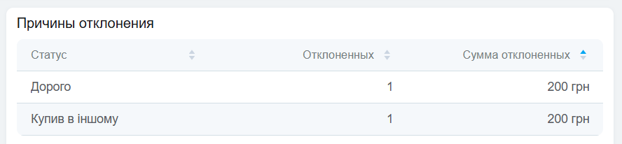 Отражает количество и общую сумму товаров в отклоненных карточках по каждому статусу отмены отдельно. По столбцам можно производить сортировку: