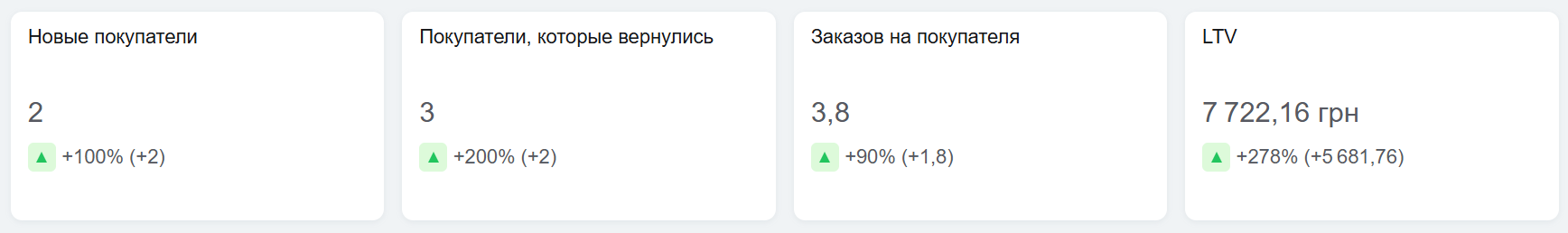 Возле каждого показателя отображается процентное соотношение показателей по сравнению с предыдущим периодом из фильтра. Зеленый – рост, красный – падение.