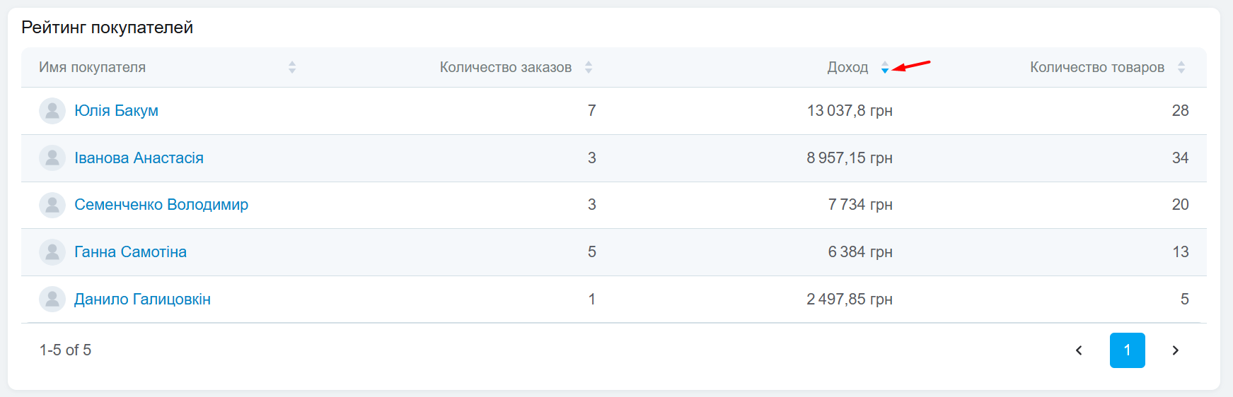 В разделе отображается список покупателей за выбранный период с основной информацией по каждому из них: