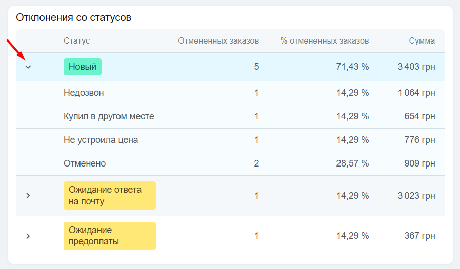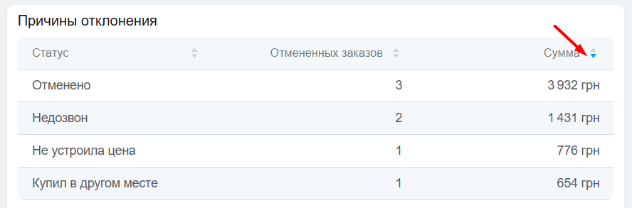 Отражает количество и общую сумму отмененных заказов по каждому статусу отмены отдельно. По столбцам можно производить сортировку:
