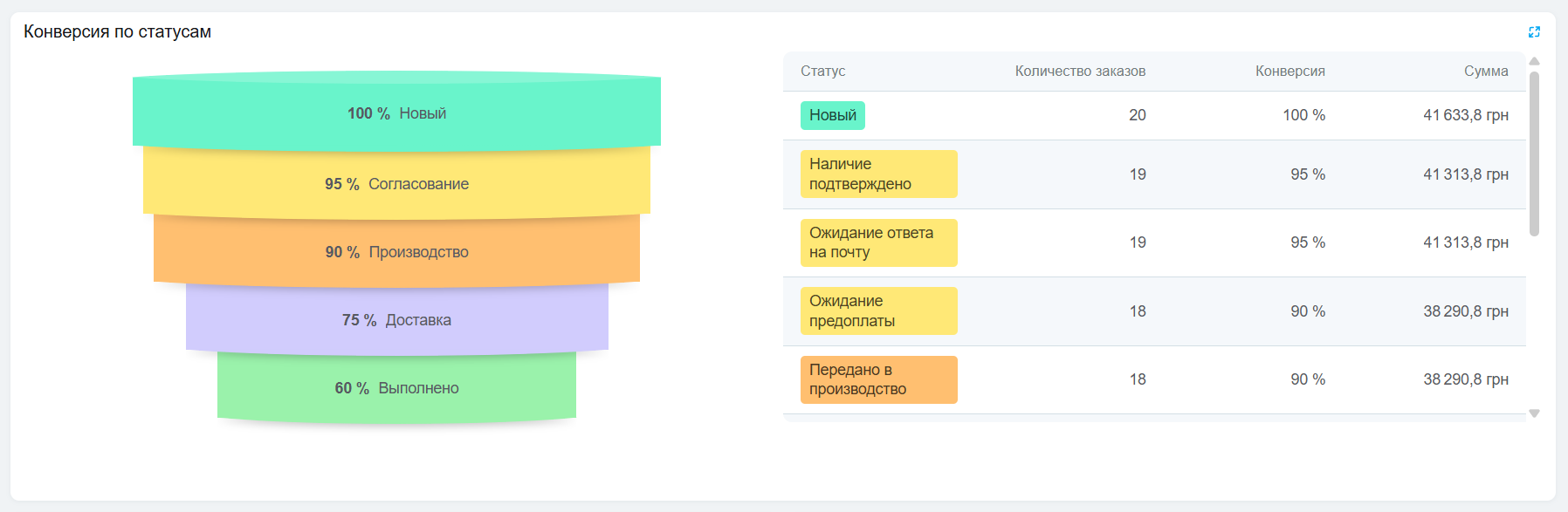 - Графическая воронка по группам статусов с процентом конверсии относительно статуса «Новый»;