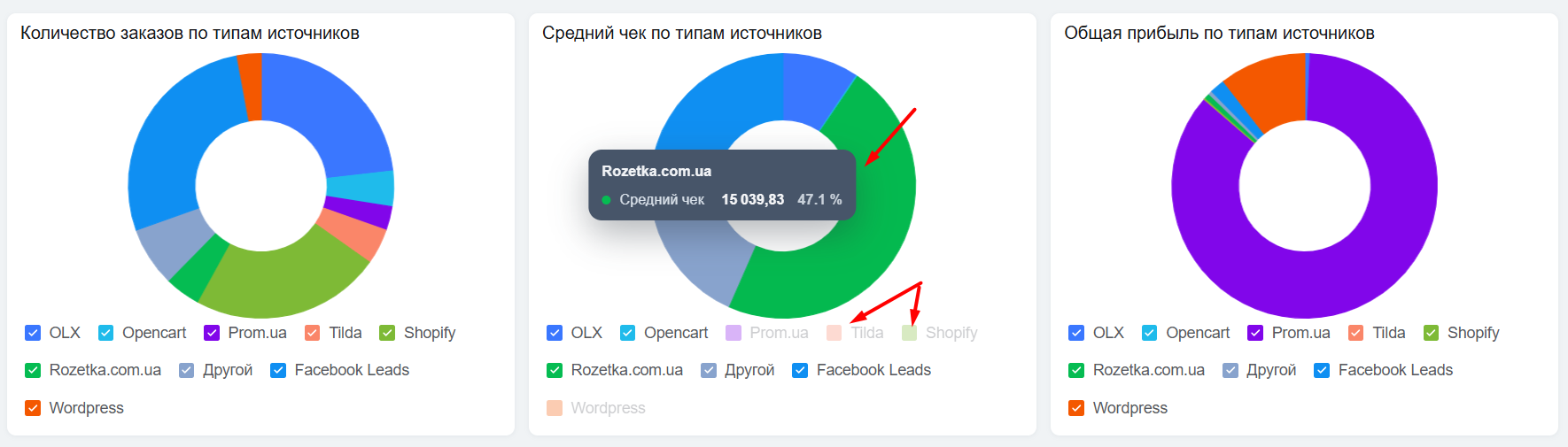 - Общая прибыль — распределение общей прибыли между типами источников;