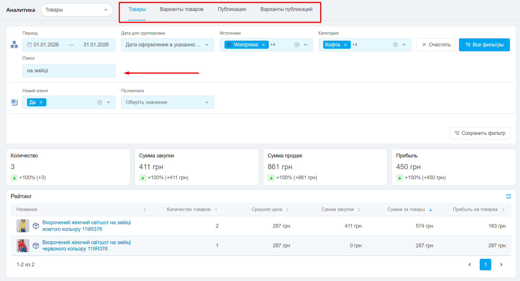 Для гибкого поиска товаров в аналитике, используйте фильтры: период, группировка по дате, источник, категория и т.д.