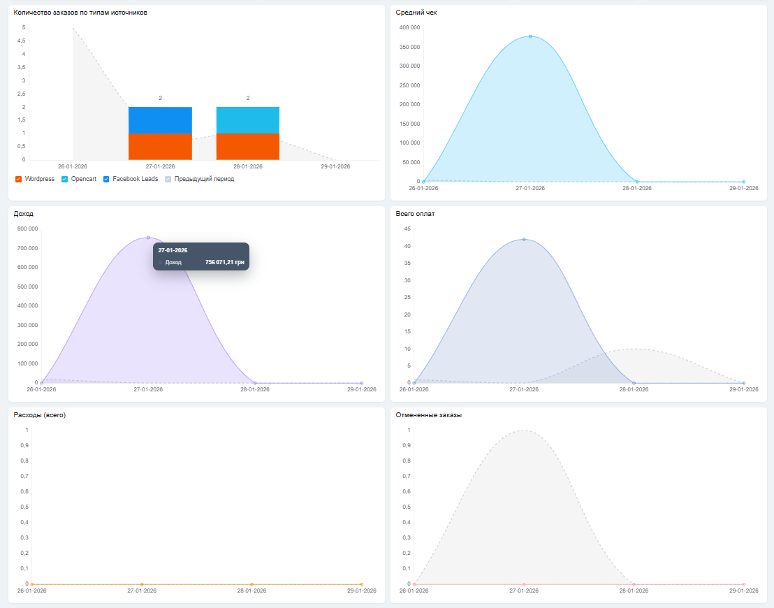 сумма за товары + стоимость подарочной упаковки + налоги + стоимость доставки – скидки = общая стоимость; - всего оплат — общая сумма оплат, которые добавлены к заказам и находят в статусе «оплачено». Сравнив его с показателем «общая стоимость», можно увидеть сколько средств получено и сколько еще ожидается получить;
