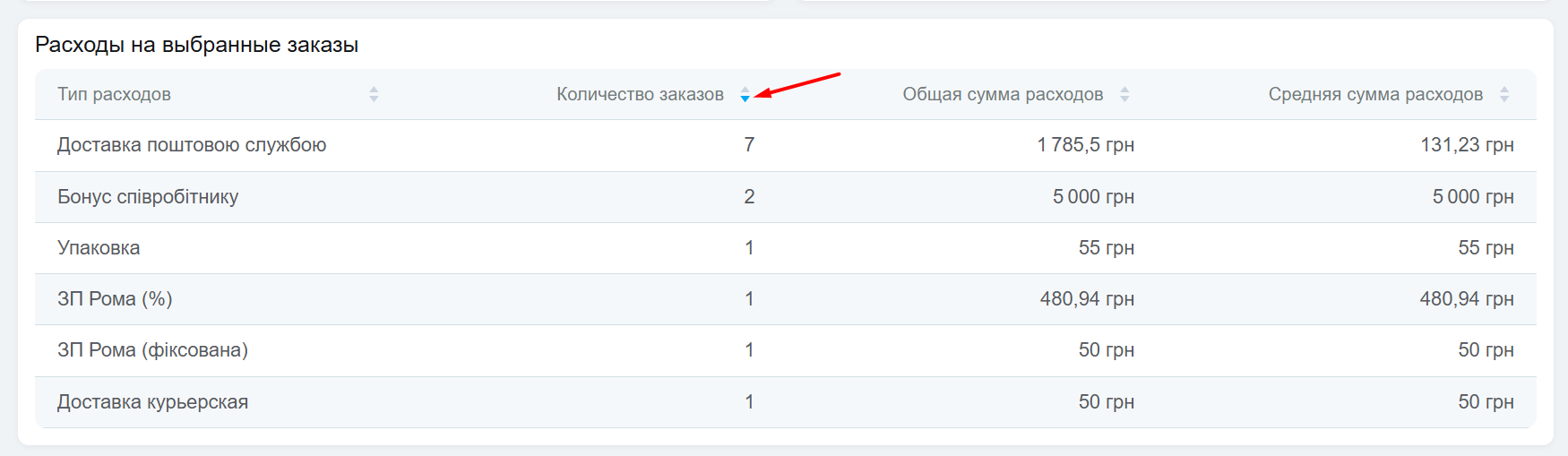 В этом блоке отображаются все расходы, которые автоматически (комиссии источника, доставка, тригеры) или вручную добавлялись к вашим заказам.