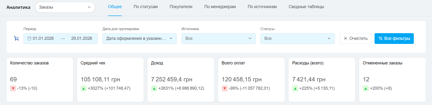 Используйте фильтры по периоду, датам группировки, статусам, источникам, дополнительным полям и т.д для формирования нужных отчетов, которые помогут в глубоком анализе продаж вашего бизнеса.