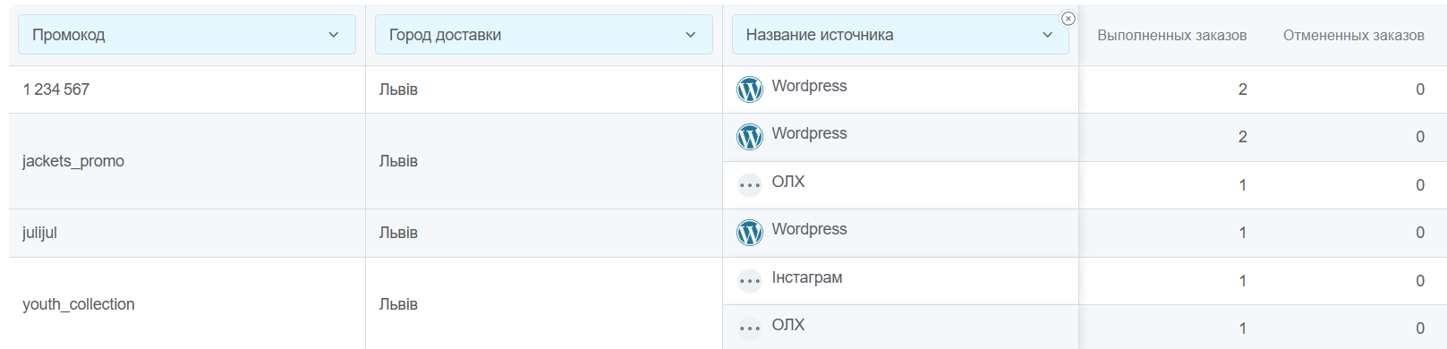 - Узнать эффективность промоакций по промокодам. Можно комбинировать с другими критериями, например, городами или областями: