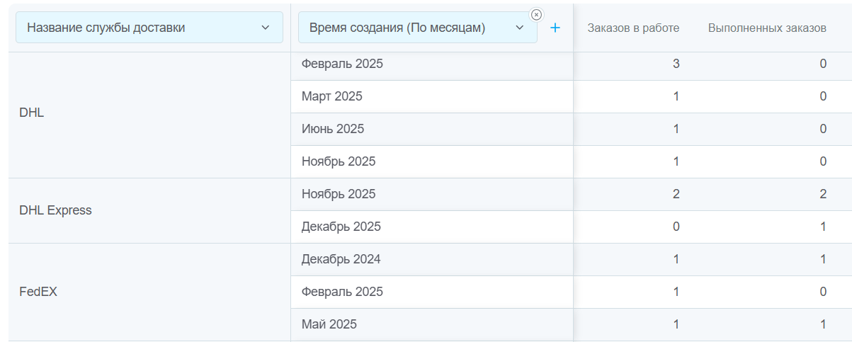 - Узнать самые популярные службы доставки и объемы отправок по ним, чтобы договориться о лучших условиях. В первой колонке выбираем критерий «Служба доставки», а во второй «Время создания (По месяцам)»: