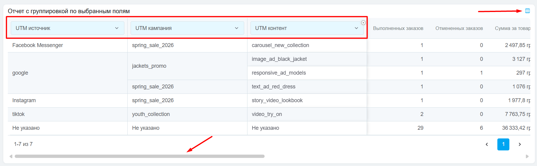 То есть, данные в каждой строке будут выводиться только по тем заказам, у которых комбинация UTM-меток соответствует комбинации значений в первых трех колонках этой строки.