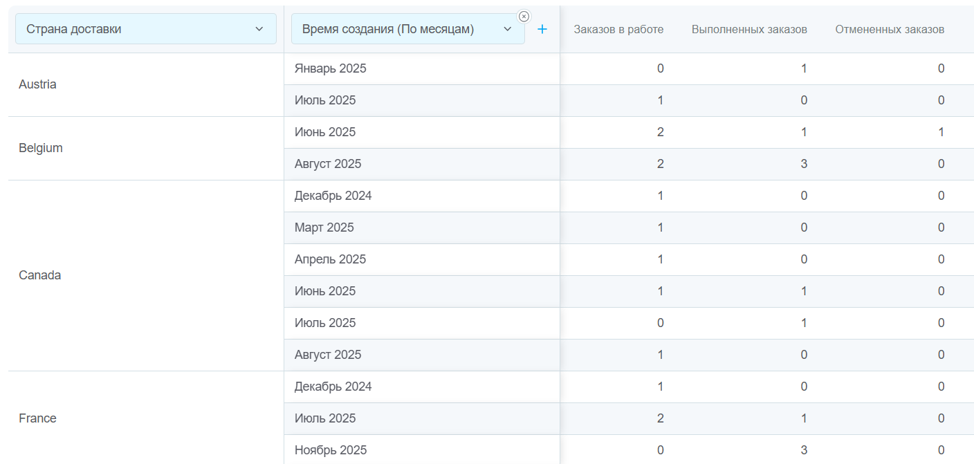 - Узнать сезонность каждой страны. В первой колонке выбираем критерий «Страна доставки», а во второй «Время создания (По месяцам)»: