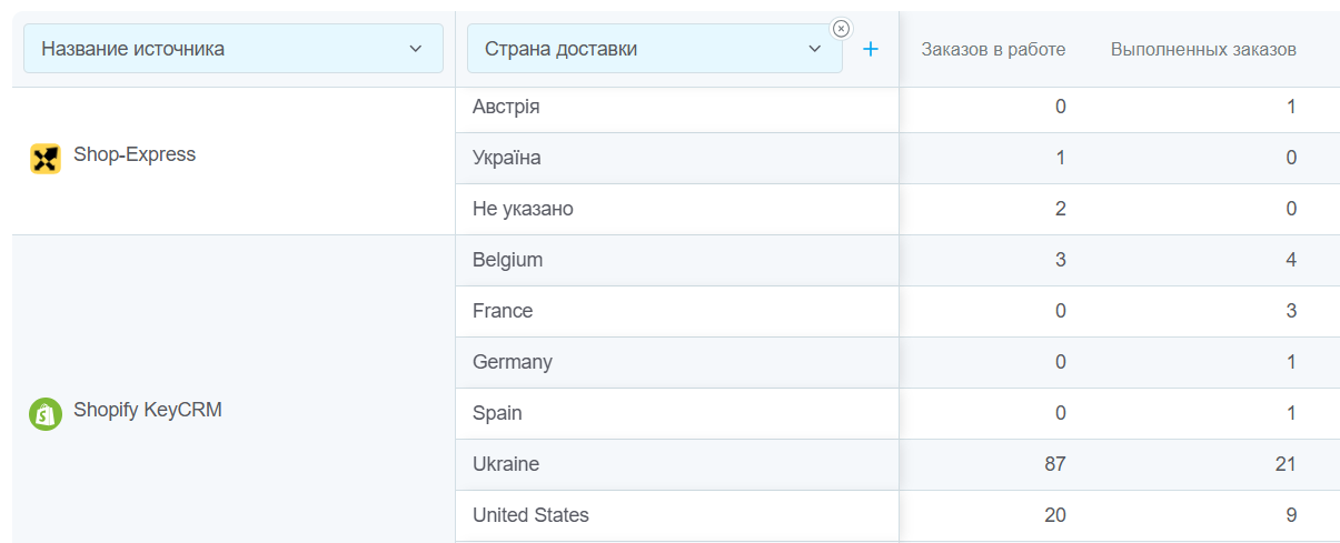 - Узнать из каких стран по каждому источнику больше всего заказов. В первой колонке выбираем критерий «Название источника», а во второй «Страна доставки»: