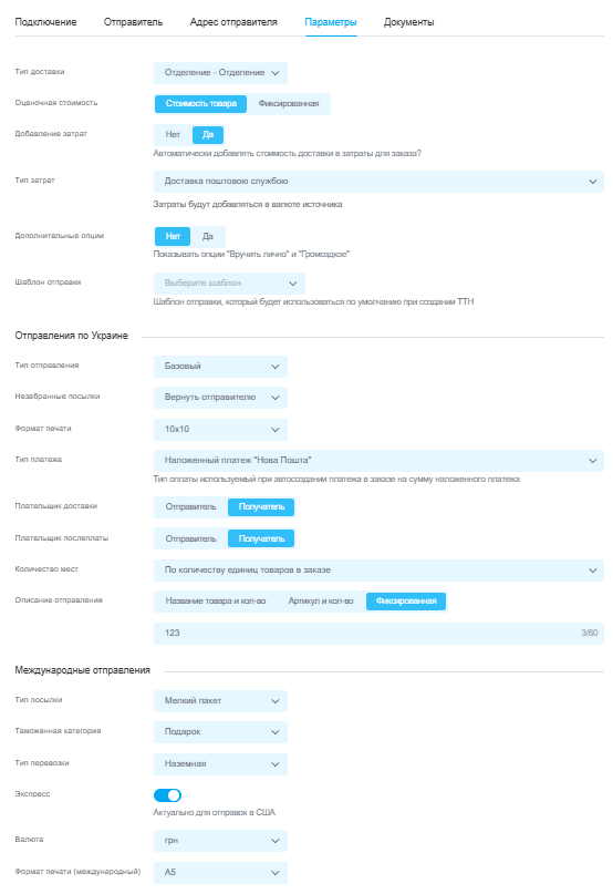 Активируйте нужные функции и установите параметры отправлений, которые используются чаще всего, чтобы они были установлены при создании ТТН по умолчанию (можно изменить в заказе при необходимости):