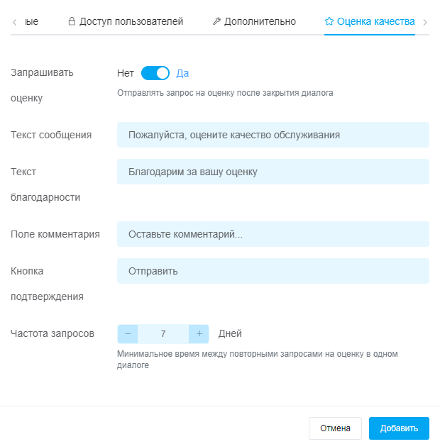Настройки оценки чатов доступны на вкладку «Оценка качества» и включите переключатель «Запрашивать оценку».