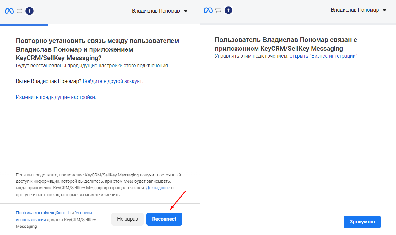При подключении других страниц с этого же аккаунта Facebook будет достаточно просто нажать на «Reconnect»: