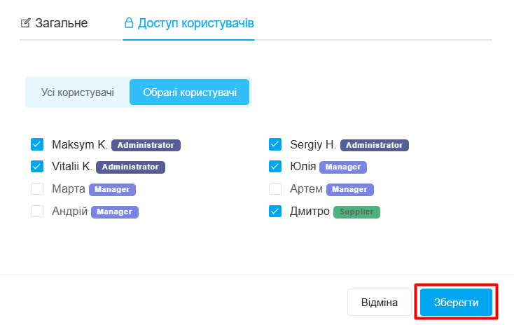Для этого нажмите на «Выбранные пользователи» и отметьте галочками сотрудников.