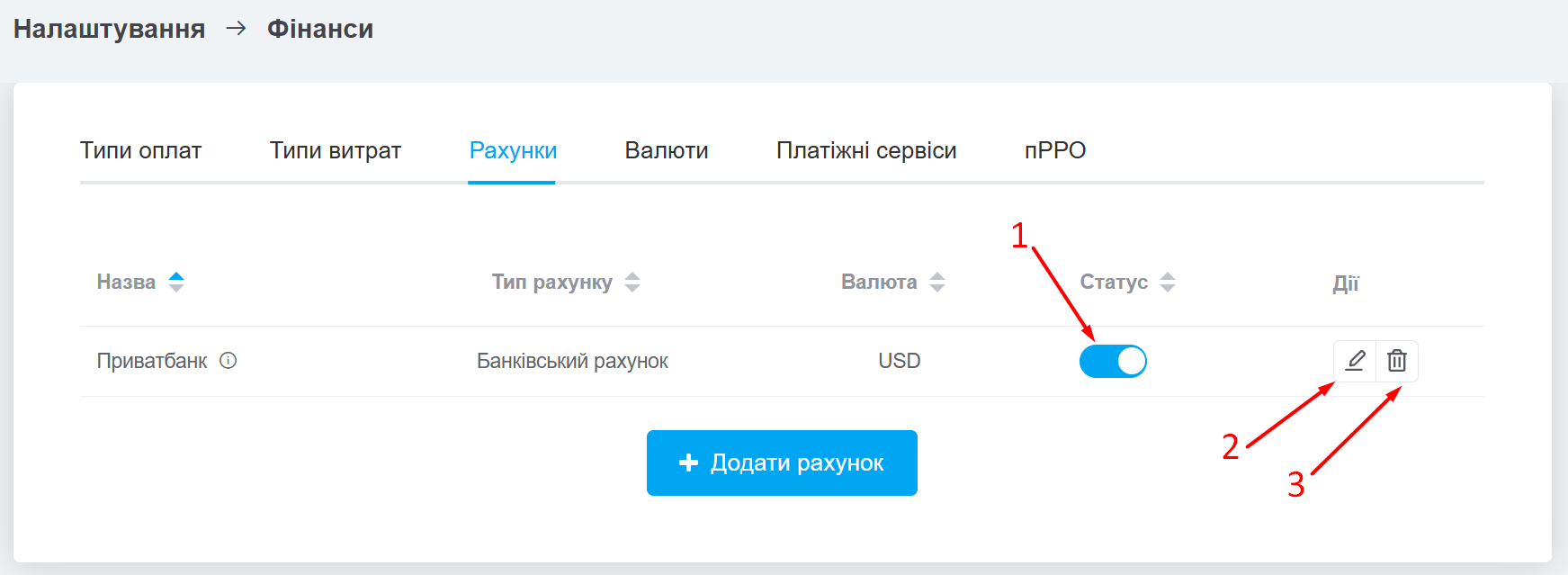 - Включить/выключить счет, нажав на переключатель в колонке «Статус».