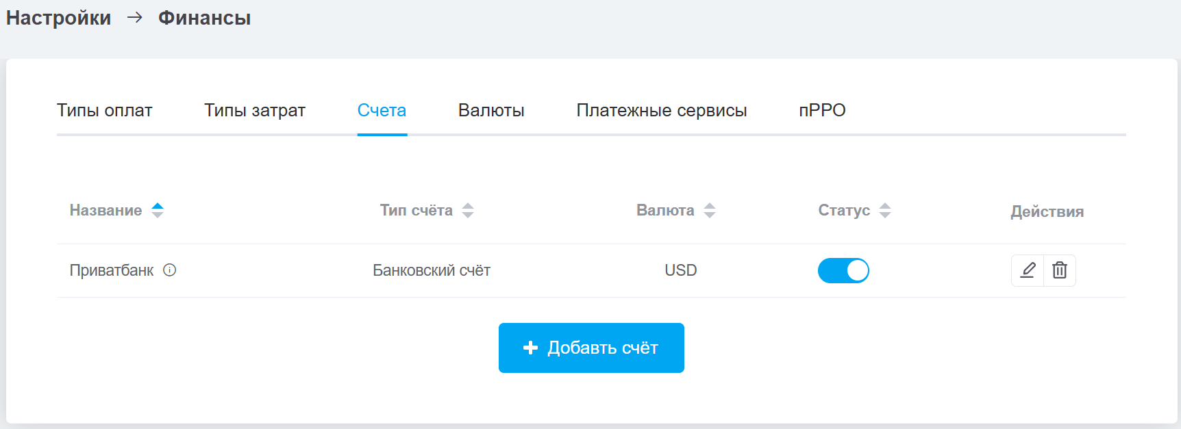 Если все счета отключены или у пользователя нет к ним доступа, блок со счетами в журнале платежей не будет отображаться; - Редактировать, нажав на иконку карандаша, которая откроет такое же окно, как и при создании счета. Можно изменить: название, тип, способы оплаты, типы расходов и доступы;