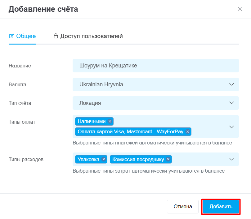 Во вкладке «Доступ пользователей» можно настроить, кто из сотрудников будет иметь доступ к определенному счету.