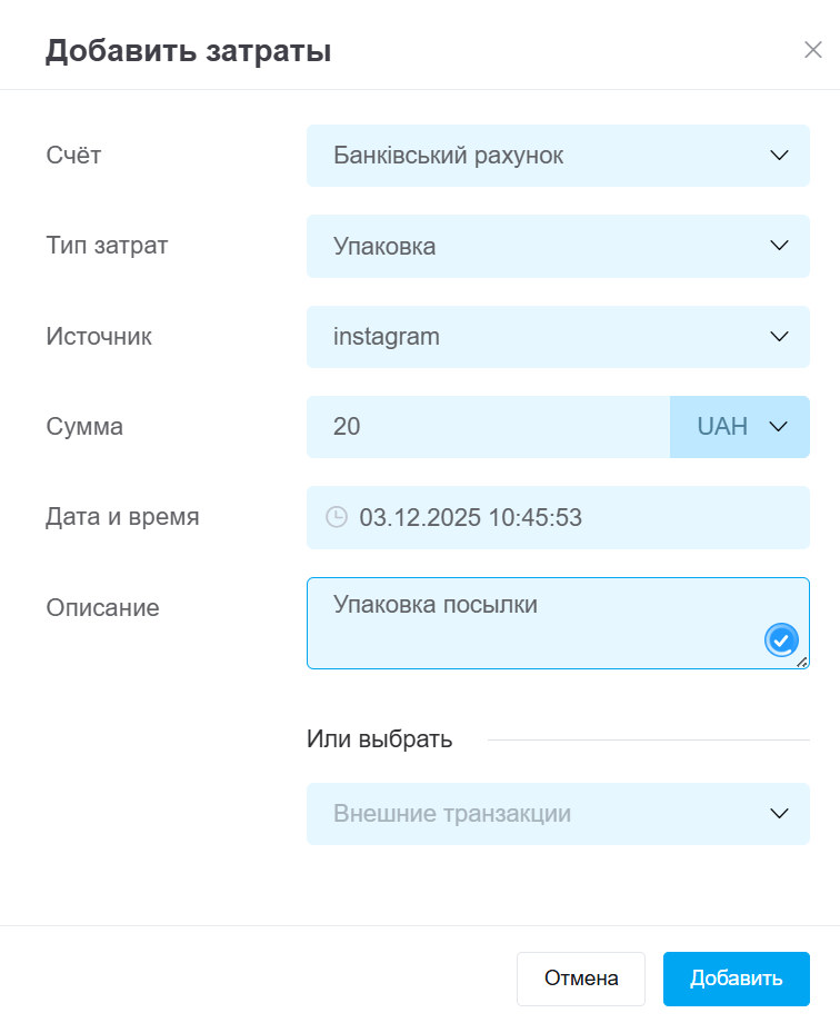 - Источник — если эти расходы относятся к конкретному источнику (например, расходы на рекламу), выберите его;