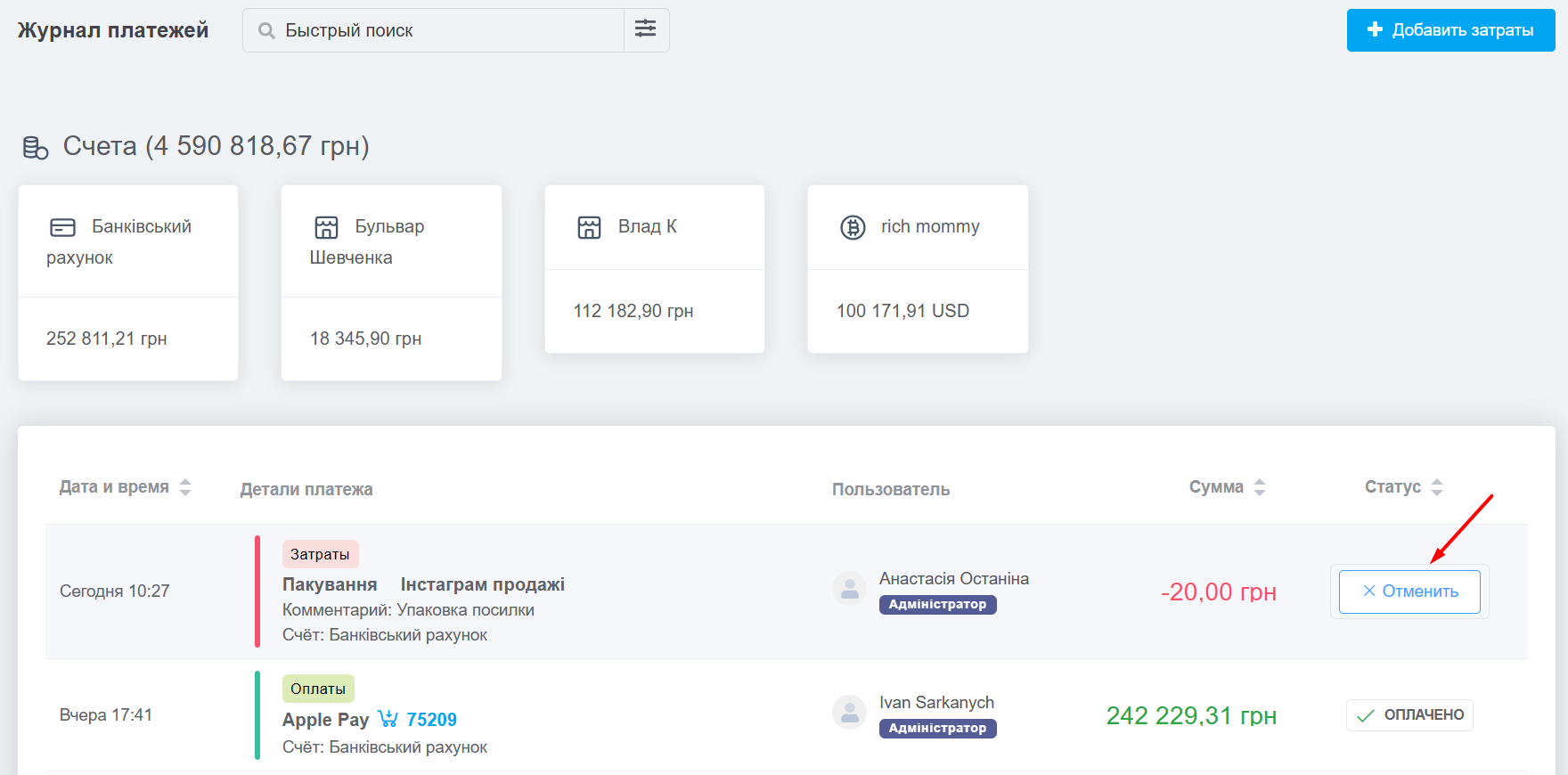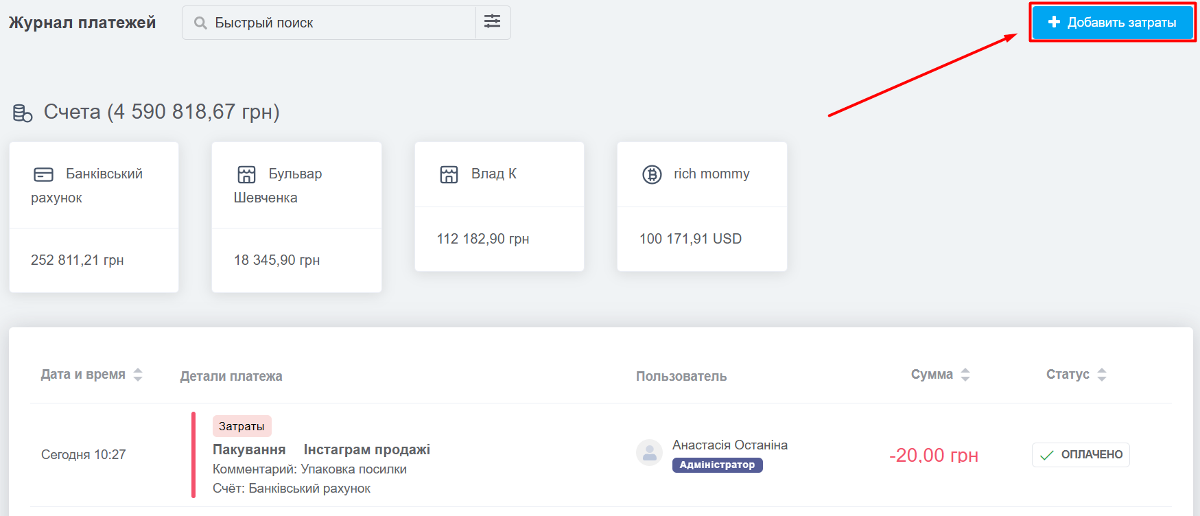Затем нажмите «Добавить», затрата будет сразу создана и отобразится в списке в журнале платежей.
