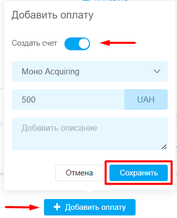 - Дополнительно можете оставить описание этого платежа в системе (не передается в счет, используется для рабочих заметок);