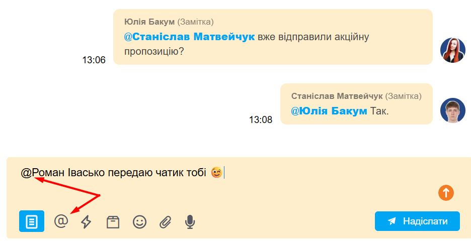В чатах, воронках и задачах в комментариях можно тегировать других пользователей, используя @. Этот пользователь получит уведомление, нажав на которое, может сразу перейти к соответствующему комментарию: