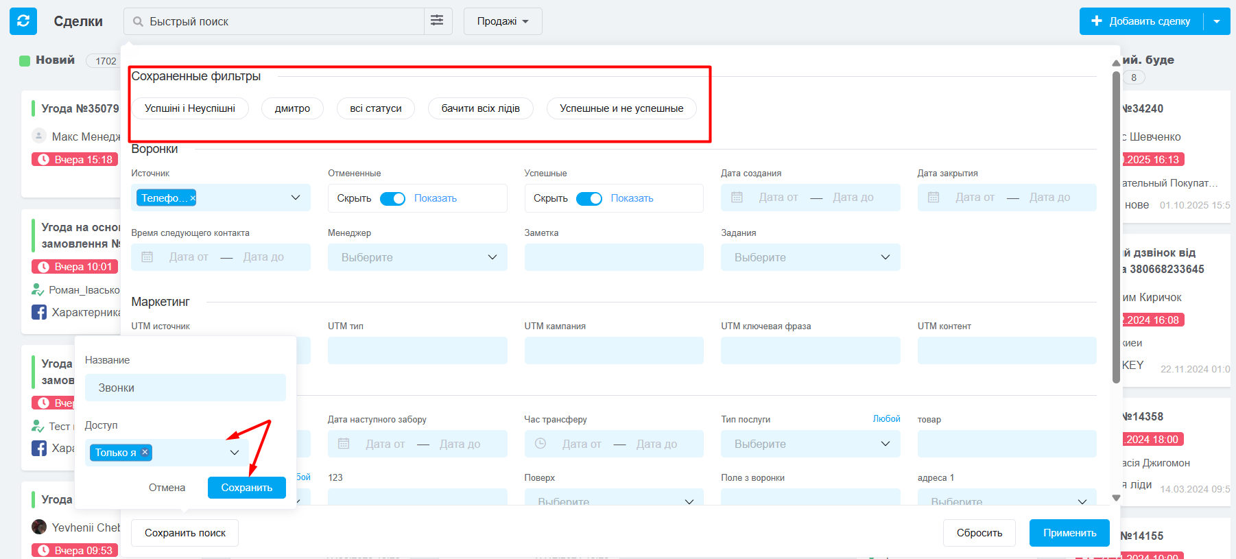 - Автосохранение покупателя, создание новой карты или перенос карты в другую воронку.