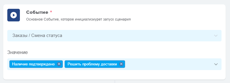 Событие — это процесс, после которого запускается триггер. Выбрав событие, у вас откроется дополнительное поле «Значение», в котором необходимо выбрать статус или сразу несколько статусов.