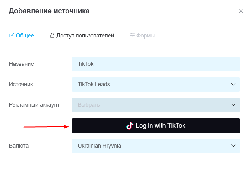 - Выберите тип источника в выпадающем списке — «TikTok Leads»;